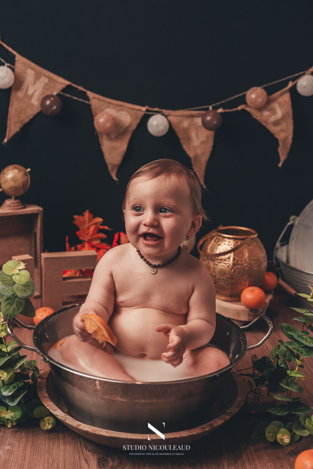 Au programme de cette séance : des photos avec papa, maman, et dans le décor en deuxième partie de séance. Le thème choisi, des couleurs automnales, avec des petites touches nature et des agrumes. Le petit garçon était un vrai petit clown, la langue toujours bien pendu =) c’était véritablement un super moment de rigolade ensuite dans le bain de lait en deuxième partie de séance.